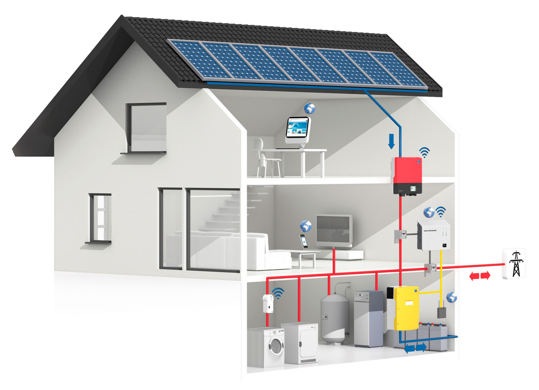 - Klíčovým zařízením u tohoto typu je hybridní střídač, který řídí všechny toky energie v domě
